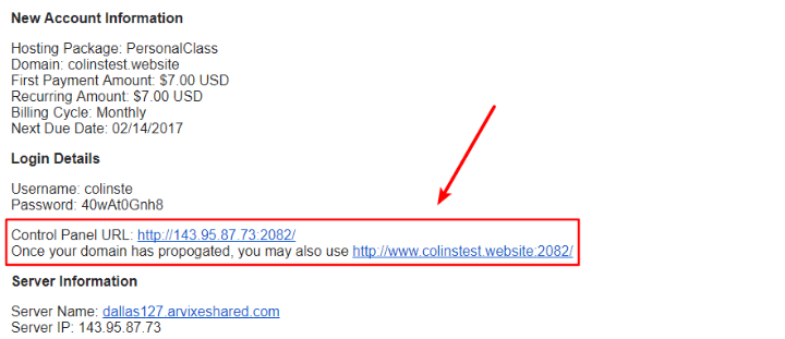 Usually, your host should send you the details for your cPanel account in a welcome email. For example, here’s the welcome email I got for one of my test hosting accounts: